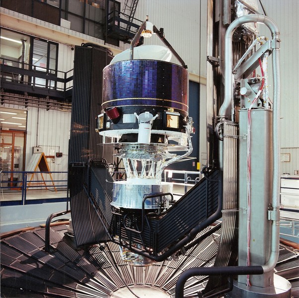 Giotto satellite flight model, solar simulation. : 84.09.004-126 [document graphique à deux dimensions] / Jan van HAARLEM, Photographe . - [s.d.] . - : Coul. ; 20x20 cm. Gratuit Test at Intespace, Toulouse, France. Le satellite européen Giotto est lancé à la rencontre de la comète de Halley en Mars 1986. Sa mission est ensuite étendue à la rencontre d'une autre comète (Grigg-Skjellerup). Le satellite est équipé entre autres d'une caméra en couleur. Langues : Anglais (eng)