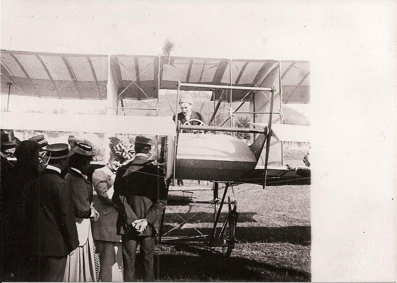 Léon Delagrande aux commandes de son avion N°3 [document graphique à deux dimensions] . - 1908 . - : n et b ; 12.5x17.5 cm. La femme vue de face serait la reine d'Italie; renseignement fourni par Jean Peltier, fils de Thérése peltier, première femme ayant volé sur avion, passagère puis élève de Mr Delagrange. Langues : Français (fre)